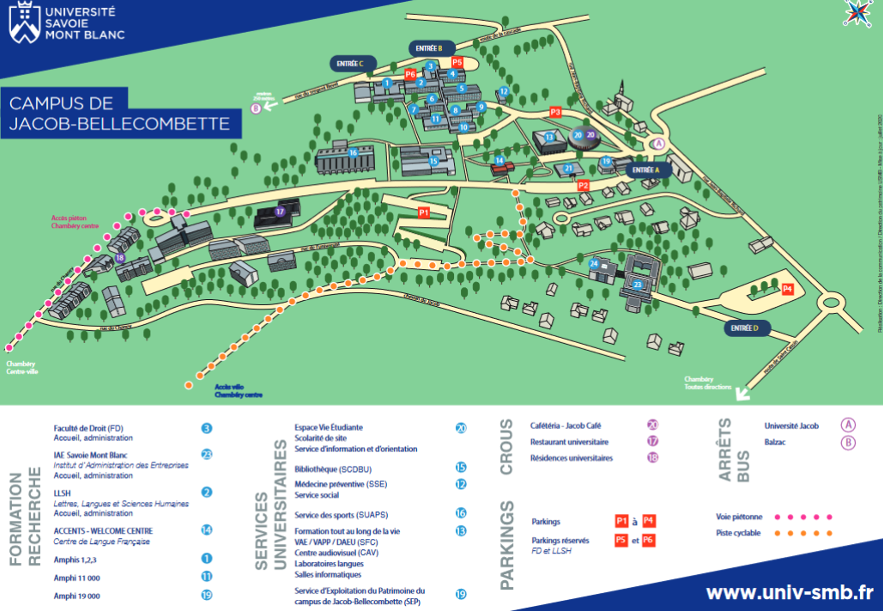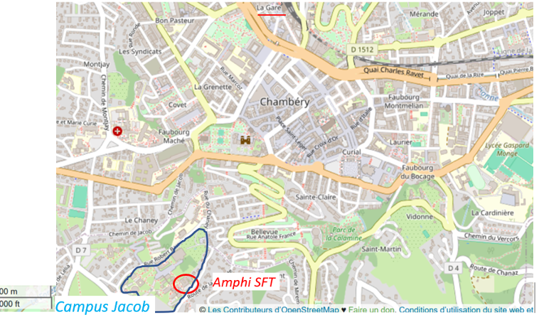 Depuis Grenoble (A41), prendre l’autoroute direction Chambéry, sortie « Chambéry centre », puis suivre « centre hospitalier puis Valence. Aux feux, prendre à gauche, direction Jacob, puis Université Savoie Mont Blanc.
